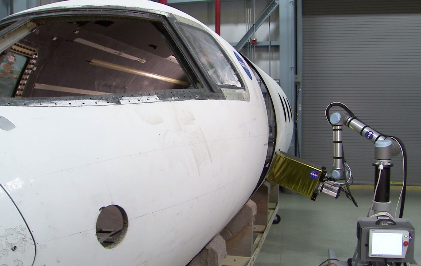 为了完成这项任务,NASA建立了一个复合飞机机身的自动检查系统。自动化系统加快了检测时间,降低了成本。UR10协作机器人只需一名操作员即可完成检查。机器人将检查头移动到预先设定的位置。RoboDK软件用于模拟和编程检查模式,确保机器人不会错过任何区域。