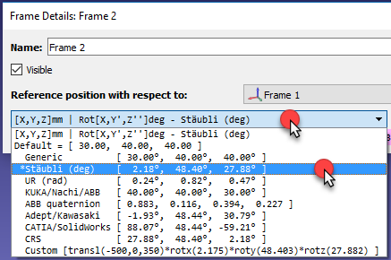 RoboDK支持所有主要机器人制造商的欧拉角约定。您可以通过每个坐标系统的设置或中的默认设置来更改每个使用的约定工具菜单>选项窗口>常规选项卡。