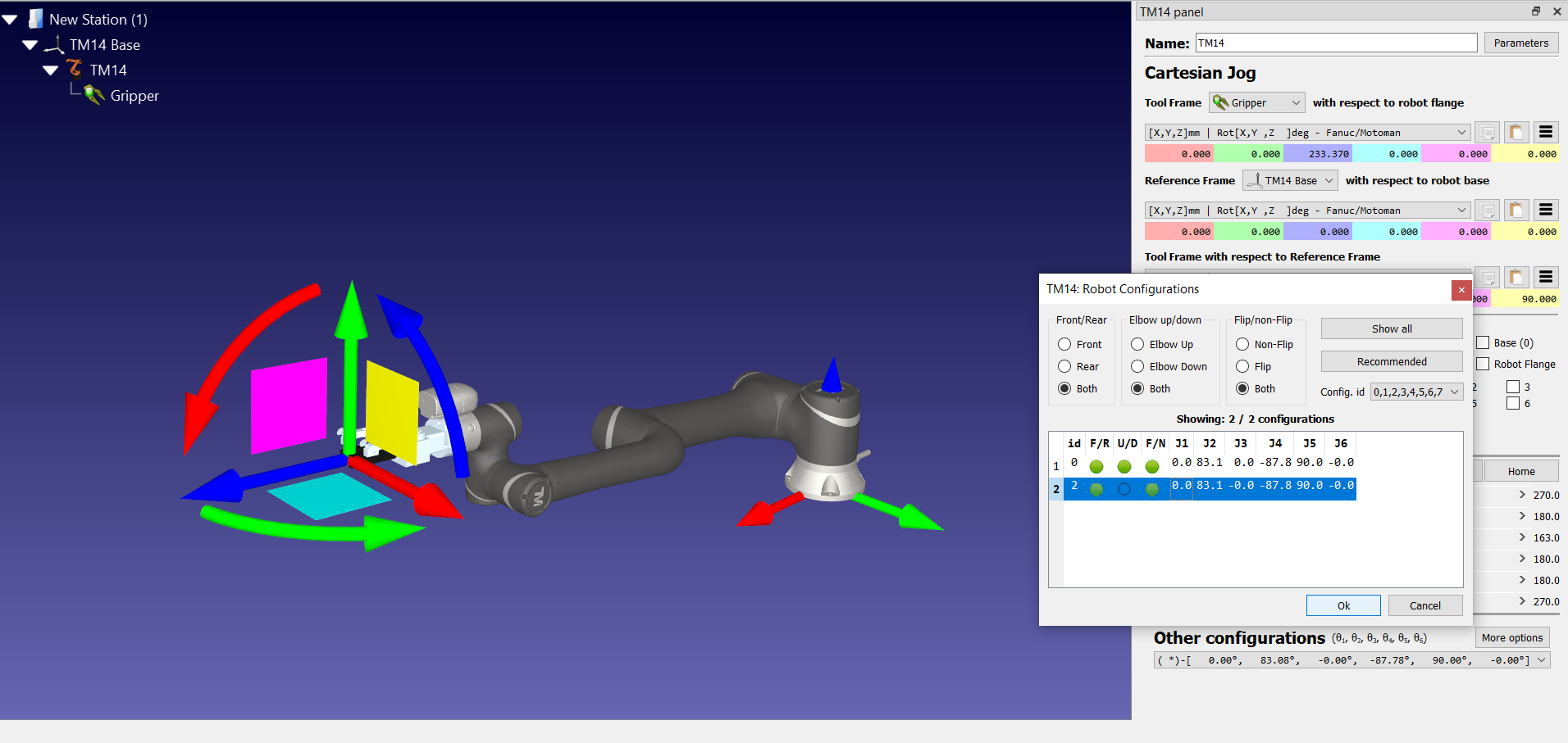 你也可以把肘部奇点看作是机器人“肘部向上”和“肘部向下”构型之间的过渡。在RoboDK中,您可以选择希望机器人使用哪种配置来达到特定的末端执行器姿势。当机器人进入肘部奇点时,这两种构型看起来都是一样的。