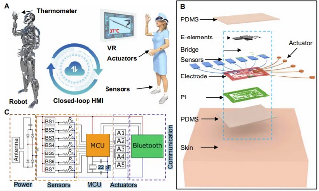 中国研究人员开发了一种闭环人机界面,将听觉、视觉和触觉虚拟现实(VR)集成到机器人虚拟现实系统中。该系统使用肤色弹性硅作为用户皮肤的粘合界面。铜线连接电池、传感器和其他电子设备,无线传输使佩戴者能够向远程机器发送指令。(H / T偶氮机器人)