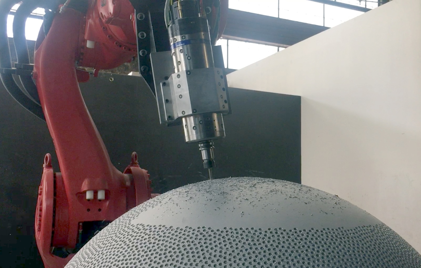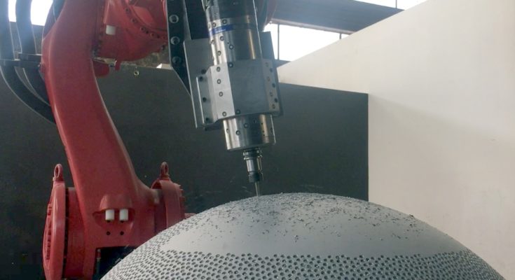 The system involved a KUKA Titan robot, the largest KUKA robot available in the market, a machining spindle and a WEISS Turntable. A Creaform C-Track measurement system was also used to reach desired levels of accuracy. RoboDK software was used for calibration and offline programming. It was possible to calibrate the robot to under 0.150 mm, the tolerance required to place each of the 40,000 holes.