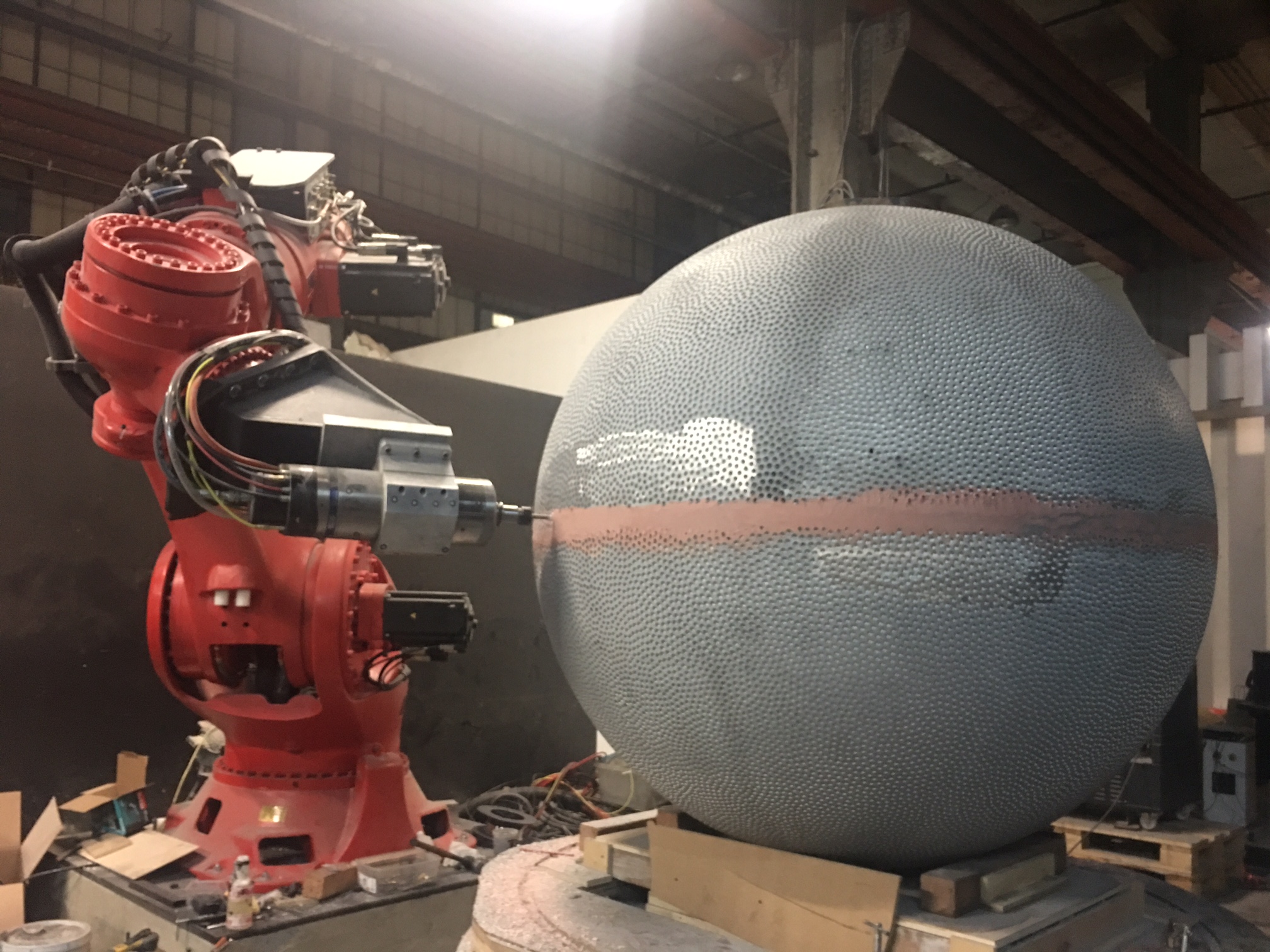 To build this 1 Ton sphere of bullets he had to split the sphere in 2 halves. Each half sphere was made from cast steel. This is important for the robot drilling process as it makes robot machining and drilling more stable. Before drilling, each half sphere was machined to have an accurate and perfectly round spherical surface.