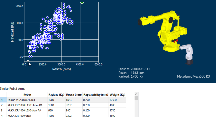 We have an interactive tool that shows “Industrial Robot Arms by Reach.”With it, you can quickly jump to the reach that is most suitable for your task from a selection of all the robots in our library.