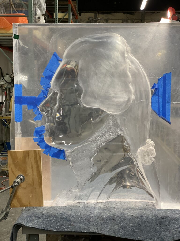 In this case, Proptogroup has worked with Kaphar on several projects over the years. This latest one was the face of Thomas Jefferson sculpted in acrylic. They used robotic milling to sculpt the head and then a final manual polishing process.