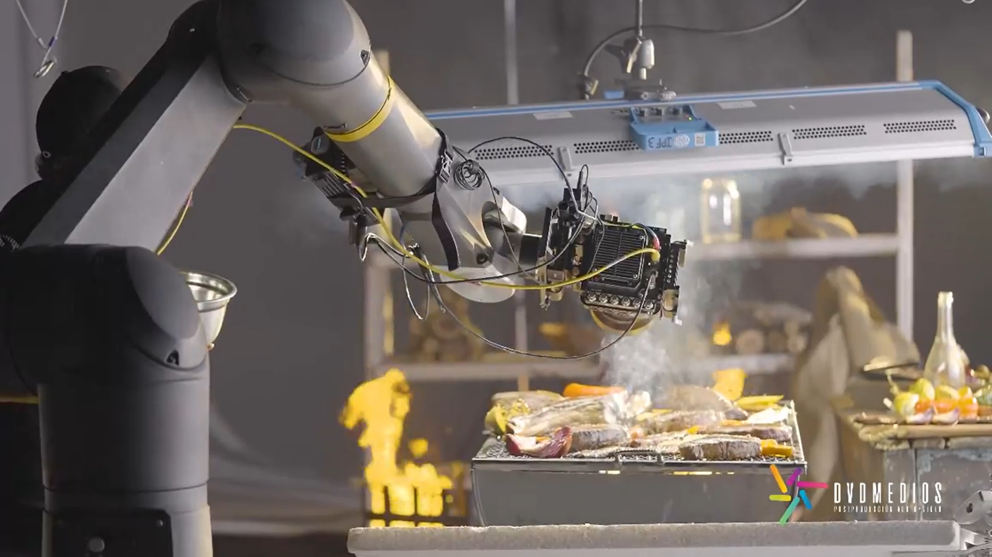 At exactly the same time, the robot needs to move the camera extremely quickly to create the dynamic shot around the food. A high-speed camera is used to capture the moment at hundreds of frames a second, with exposures of less than 1/1000 of a second.